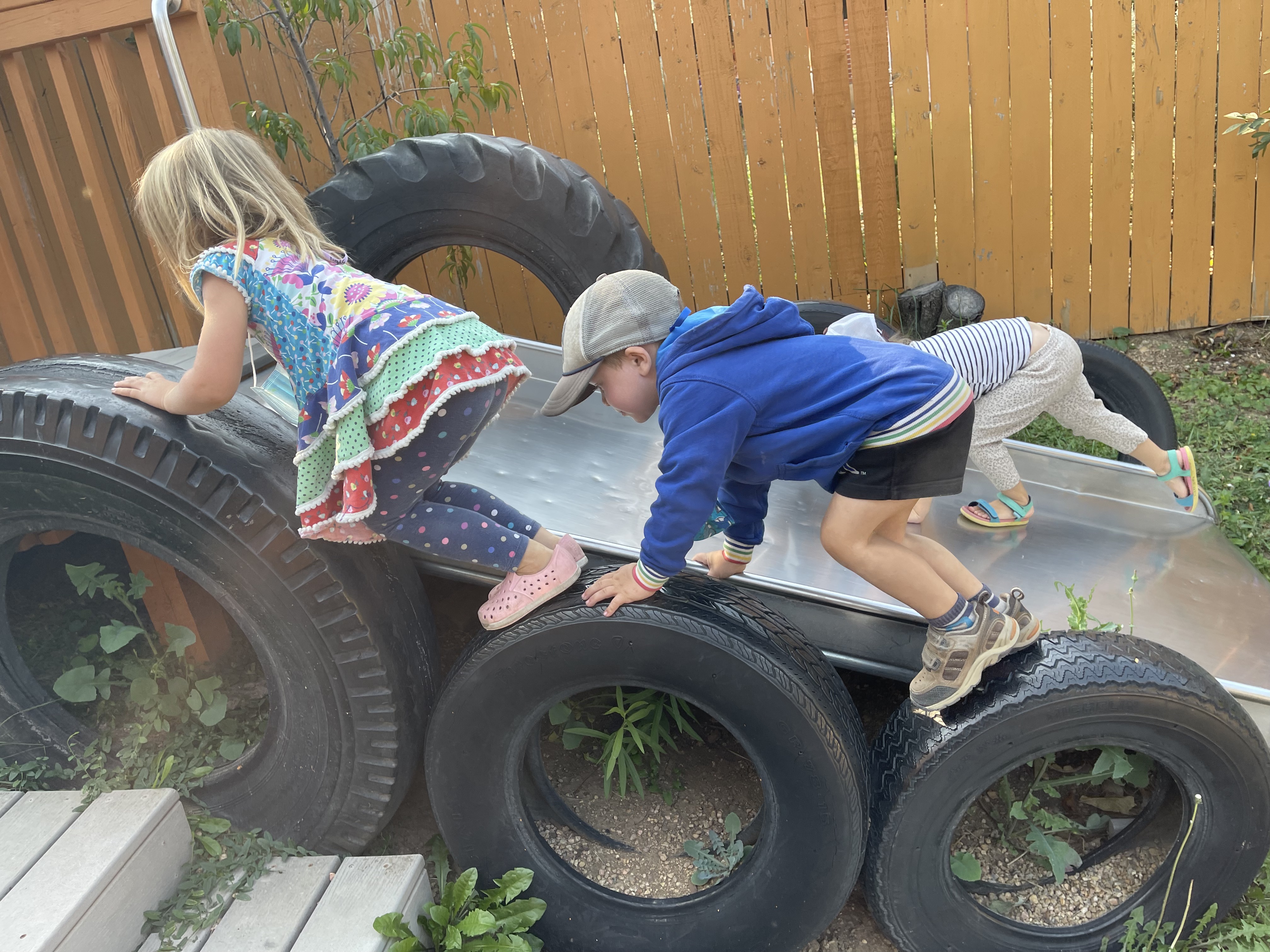 Since 2012 we have been a certified Nature Explore Classroom so our newest additions to the outdoor environment has consisted of our Nature Explore designated areas including: The Theater, Messy materials area, Nature art area, Sand and water area, and the Gathering area.