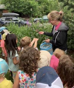 Another aspect of our outdoor curriculum is the berm mini-ecosystem. We use the berm as a teaching tool, as well as an additional part of our outdoor classroom. During the summer months, we often eat lunch in the recently added Coolaroo Sun Shades and the cool shady area next to the berm. The children are drawn to the berm to observe insects and birds. They also enjoy learning about native plants, gathering flowers, going on teacher-led scent and touch tours, and relaxing around the fountain area.